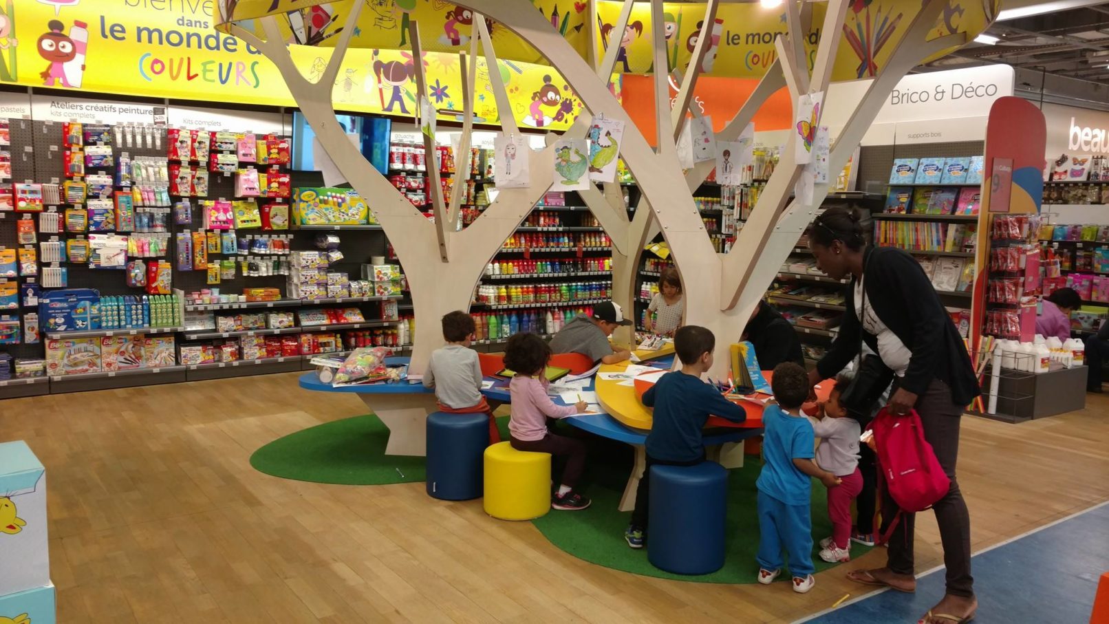 En collaboration avec Stabilo International, création d’un univers « Le monde des couleurs », qui habillera le nouvel espace destiné aux enfants, qui regroupe tous les produits – feutres, peinture, crayons, etc – liés à la couleur. 3 mascottes seront présentes toute l’année sur cet espace et viendront l’animer en fonction des moments marquants de l’année (rentrée des classes, fêtes de fin d’année…). Une tablette et un écran vidéo appuient l’habillage du mobilier, développés en parallèle avec Tip Top Productions et Particules interactives.